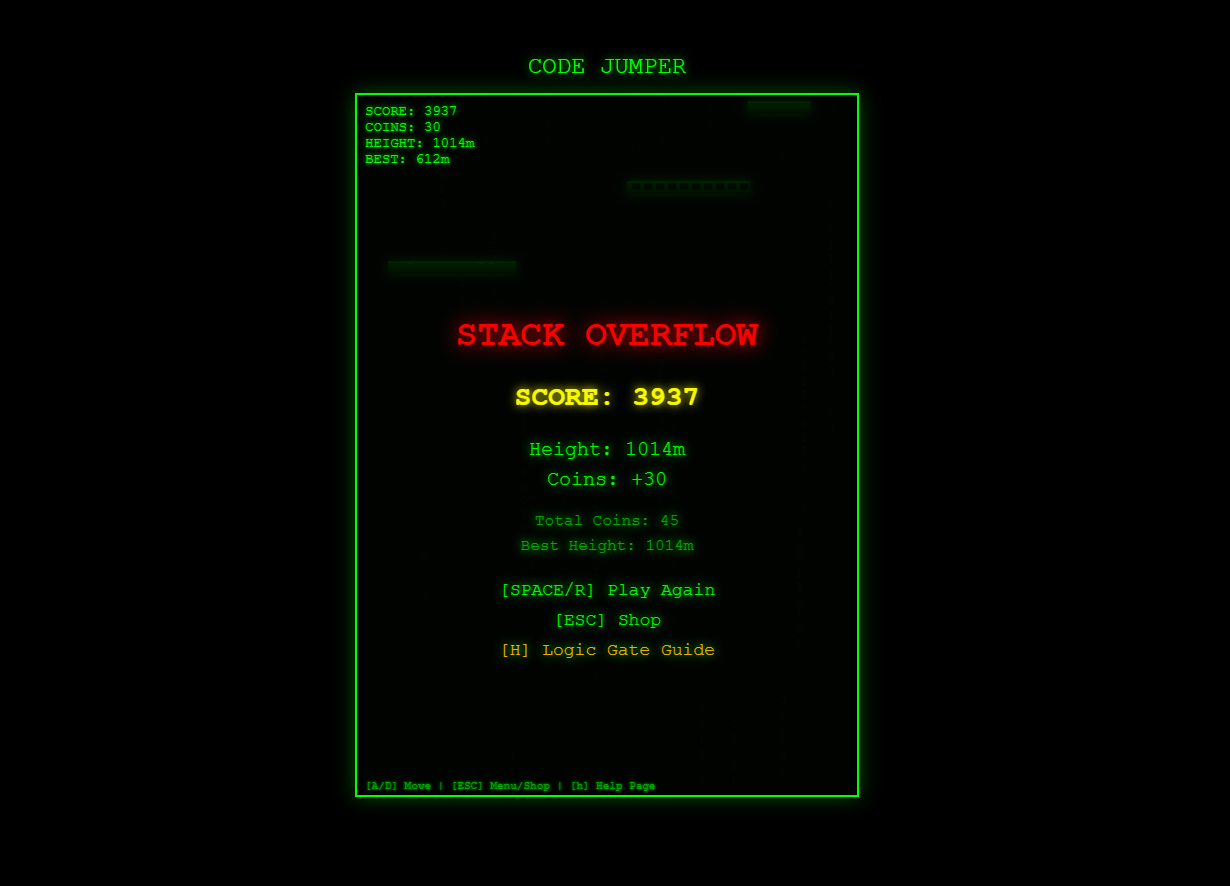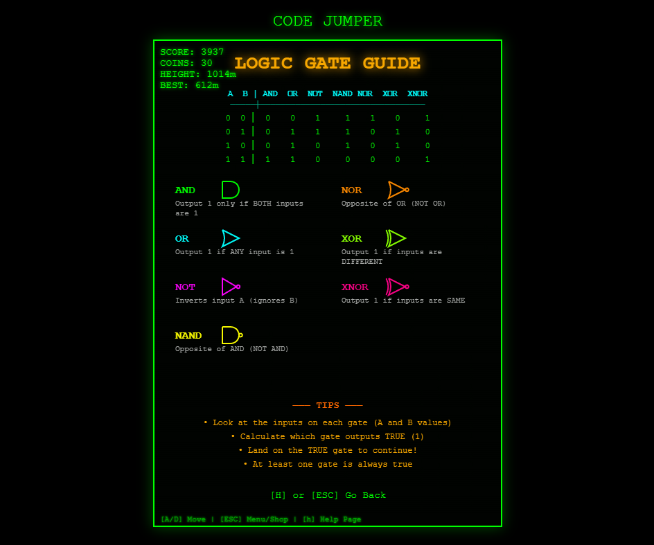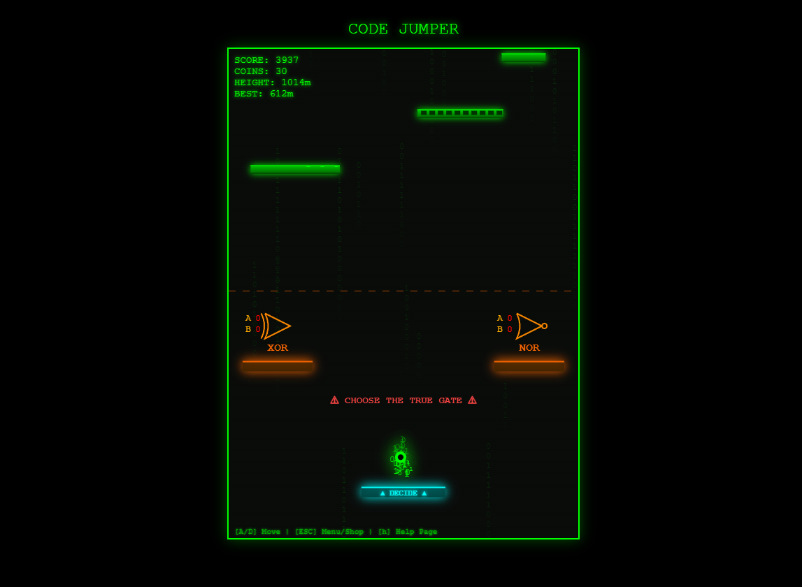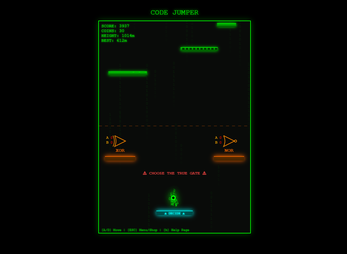 Code Jumper is a fast-paced arcade platformer designed to help players learn and practice logic gates while chasing high scores.